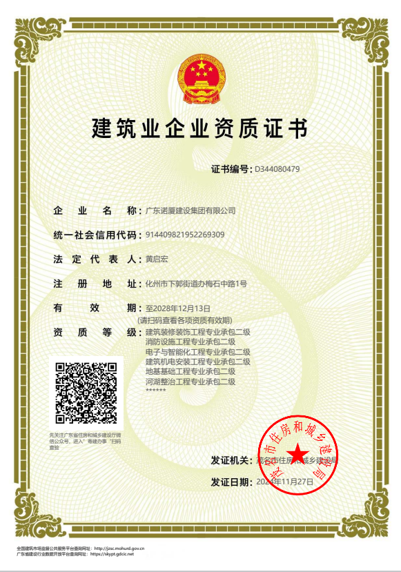 广东诺厦建设集团有限公司是诺厦集团的核心企业,具备国家房屋建筑工程施工总承包壹级、市政工程施工总承包壹级、港口与航道工程总承包、建筑装修装饰工程、消防设施工程、地基基础工程、机电设备安装工程、体育场地设施工程、建筑智能化工程、河湖整治工程、水利水电工程等资质。......
